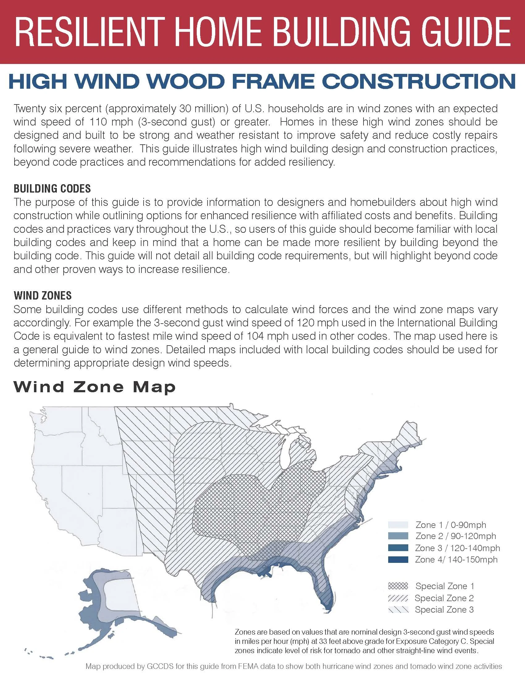 The Resilient Home Building Guide was created to help designers understand high-wind structural systems, materials and details for wood frame house construction. The guide was produced to be used by FLASH – The Federal Alliance for Safe Homes. Input on the content and organization of the guide came from a two-day charrette that brought together design professionals and building industry experts from around the country. The guide explains the different structural components - roof, walls and foundations - of house construction by presenting three construction types for each component. The three construction types are ordinary construction, high wind construction that is generally required by various building codes, and most importantly, increased resilience construction. The explanation of increased resilient construction is the purpose of the guide and includes ways to make houses stronger and more resistant to rain and wind in order to reduce the damaging effects of a storm.